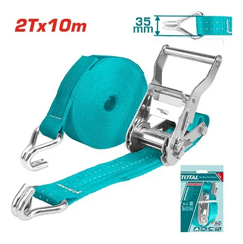 Eslinga de carga con correa de Poliéster capaz de cargar hasta 2 toneladas. La longitud de la correa es de 10 metros con un ancho de 35 milímetros. Posee doble gancho uno de trinquete y otro doble