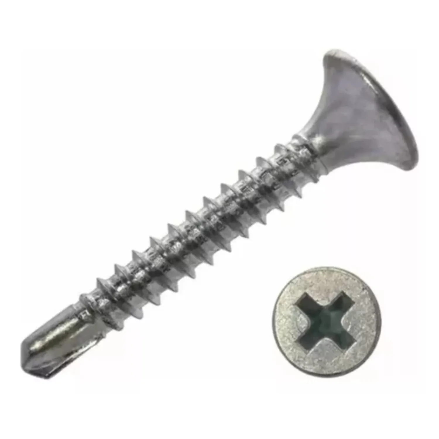 Fabricado en acero zincado, garantiza durabilidad y resistencia a la corrosión, lo que lo convierte en una opción confiable para proyectos de construcción y remodelación. Su cabeza plana tipo trompeta y su forma de punta broca permiten una fácil inserción y un acabado limpio, asegurando que cada instalación sea rápida y eficiente.